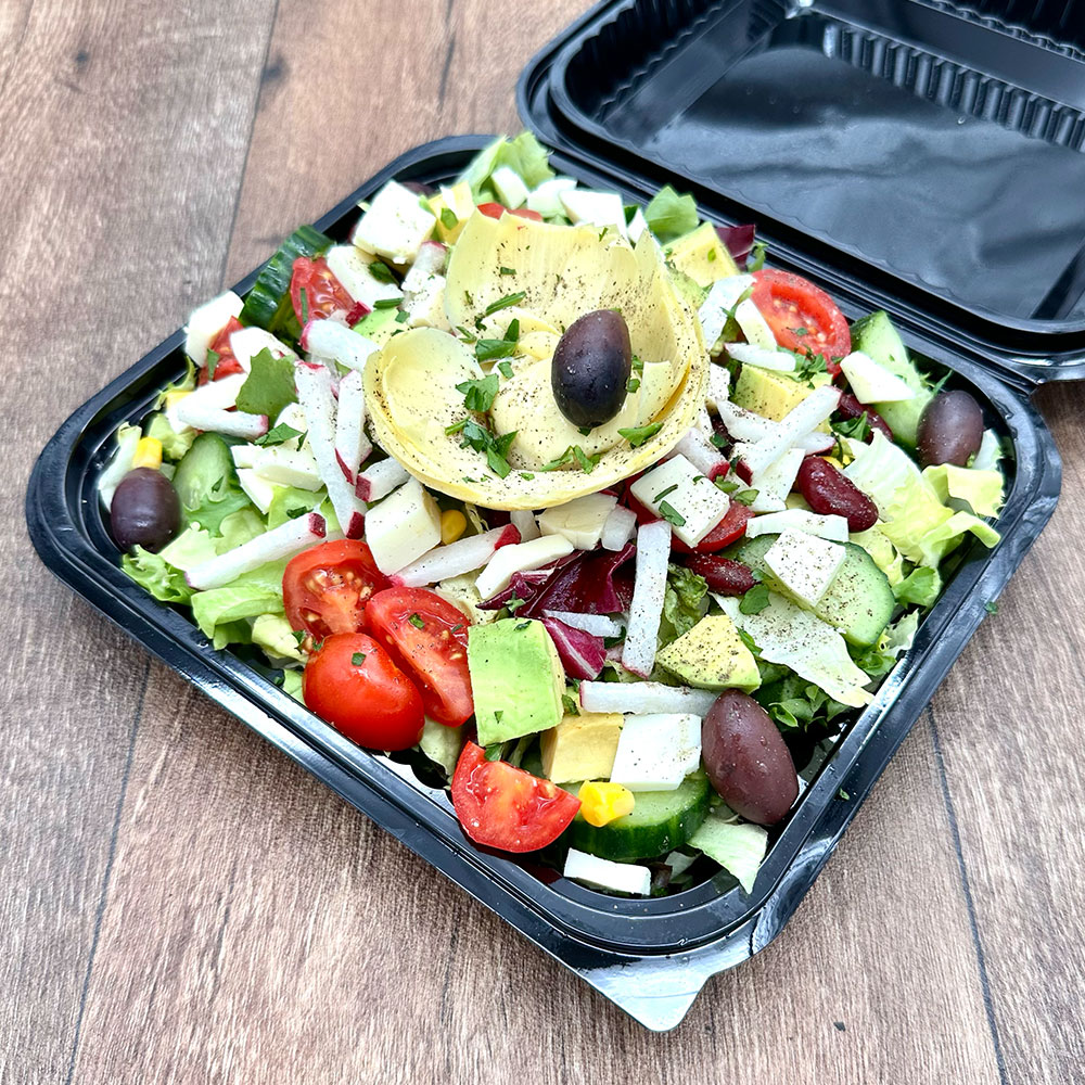 die Bohnen, Kirschtomaten, Mais, Avocado gewürfelt sowie die Radieschenstifte und den gewürfelten Mozzarella auf den Salat legen.
