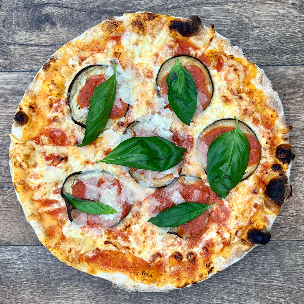 Die Auberginen auf der Pizza verteilen. Beginnend mit einer Scheibe in der Mitte und 5 drumherum legen. Die Scheiben mit einem Klecks Tomatensauce dekorieren.