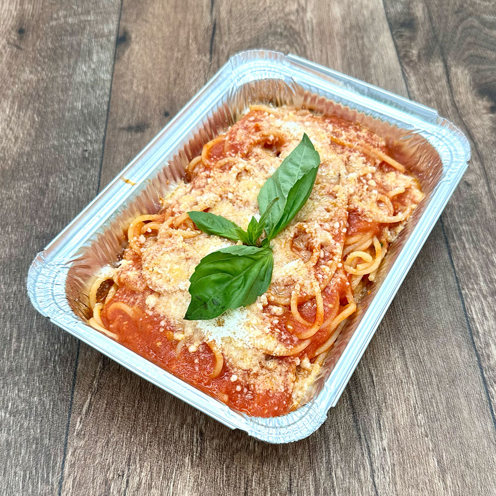 Tomatensauce köcheln lassen und die Spaghetti dazugeben.