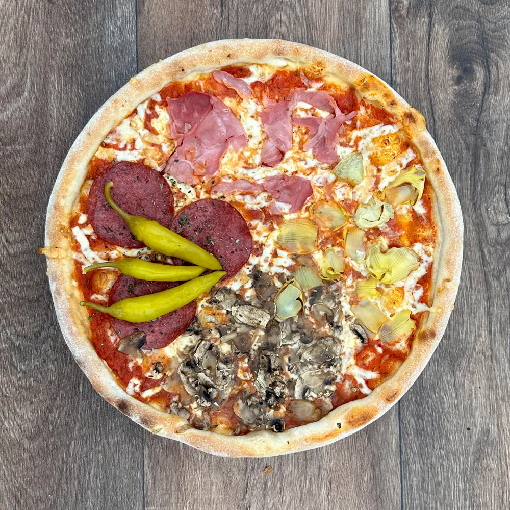 Die Salami, Schinken, Funghi und Artischocken zu jeweils 1/4 der Pizza belegen so das wir 4 verschieden Belegte Ecken haben.
