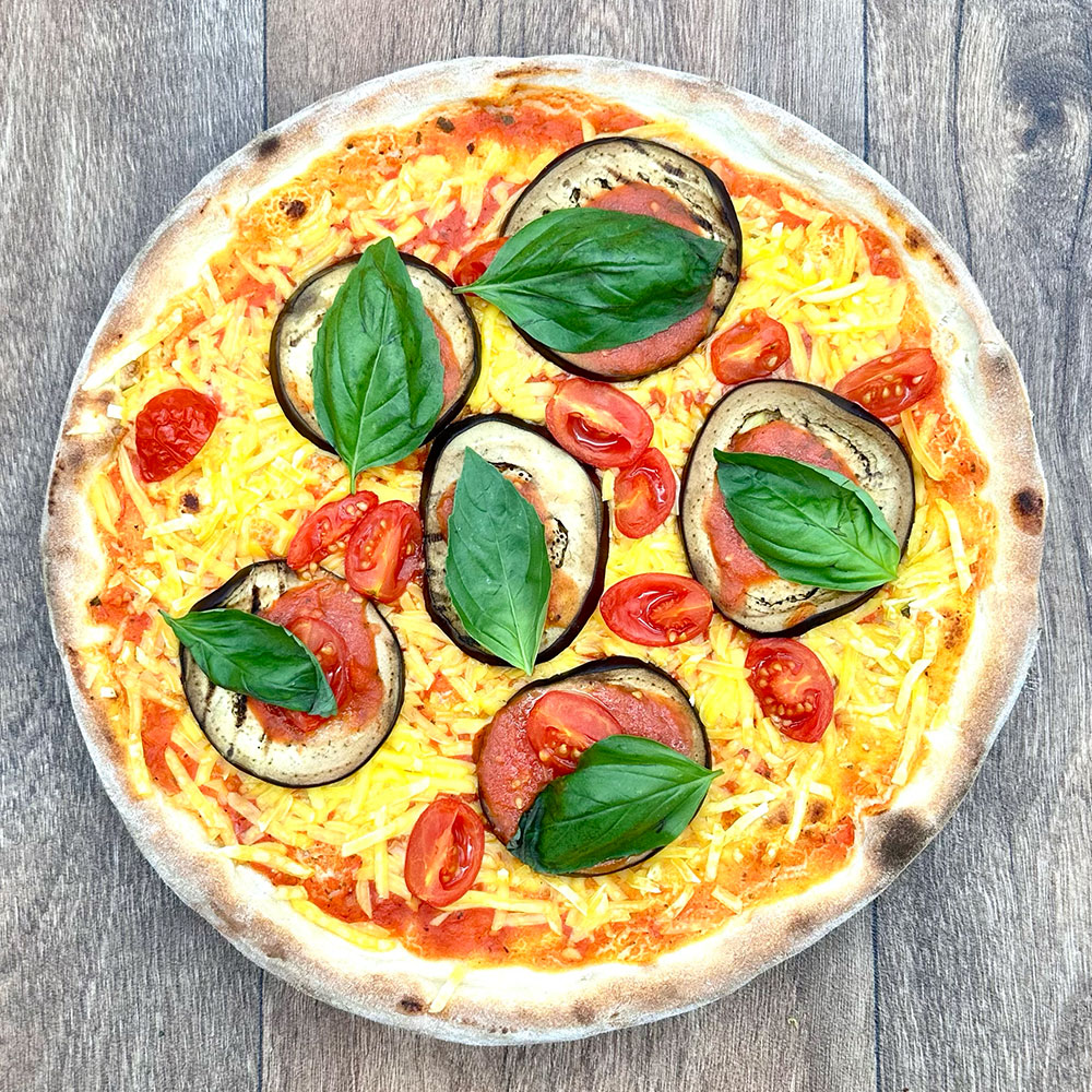 Die Auberginen auf der Pizza verteilen. Beginnend mit einer Scheibe in der Mitte und 5 drumherum legen. Die Scheiben mit einem Klecks Tomatensauce dekorieren.